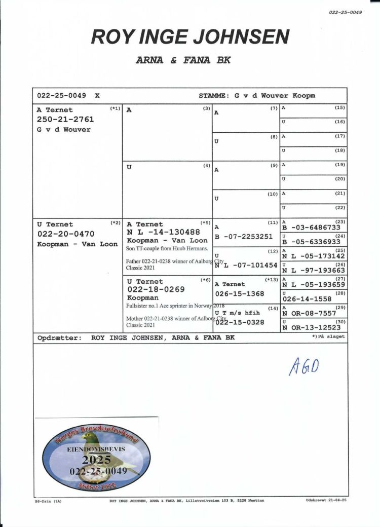Owner: Roy Inge Johnsen (378º Final / Ace Pigeon:312º)