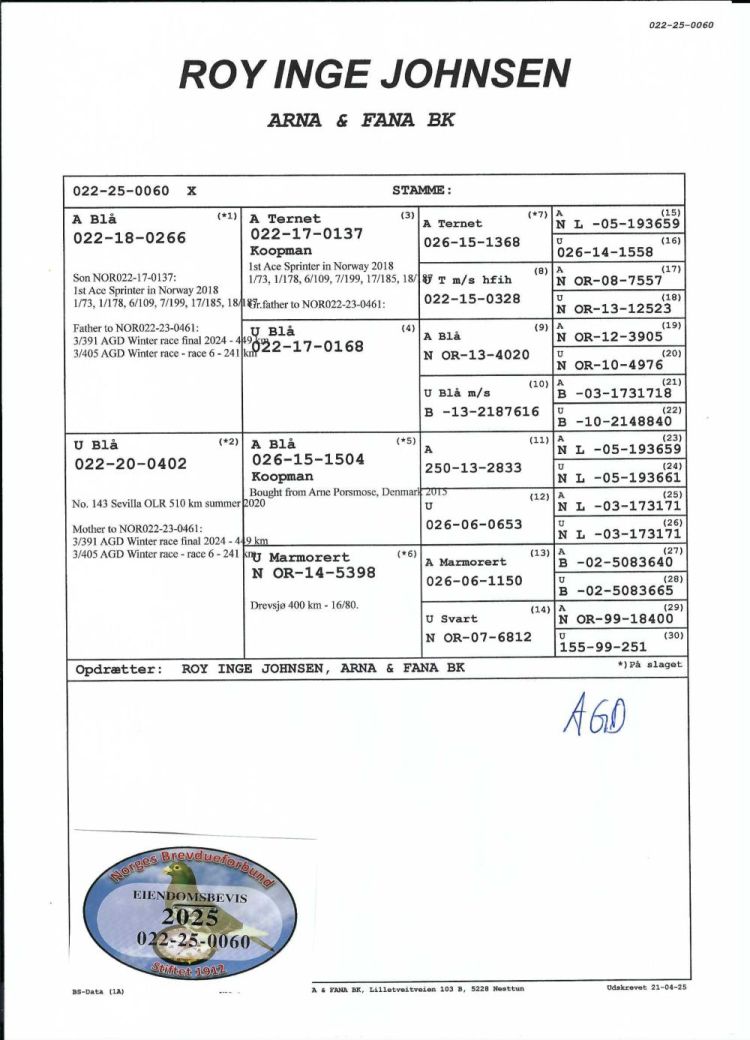 Owner: Roy Inge Johnsen (335º Final / Ace Pigeon:531º)