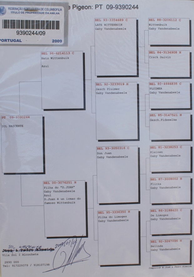 Em 2009, JOSÉ C. MIGUÊNS, adquire mais uma peça de coleção que se veio mostrar de um nível superior no que toca a reproduzir campeões, nada mais nada menos que a fêmea 9390244/09 Original Sol Nascente, irmã do 1º Pombo Ás Nacional Velocidade 2011, 100% Gaby Vandenabeele (filha do BE 96-6214113 Neto do Wittenbuick x BE 00-3076251 Filha do D.Juan).
