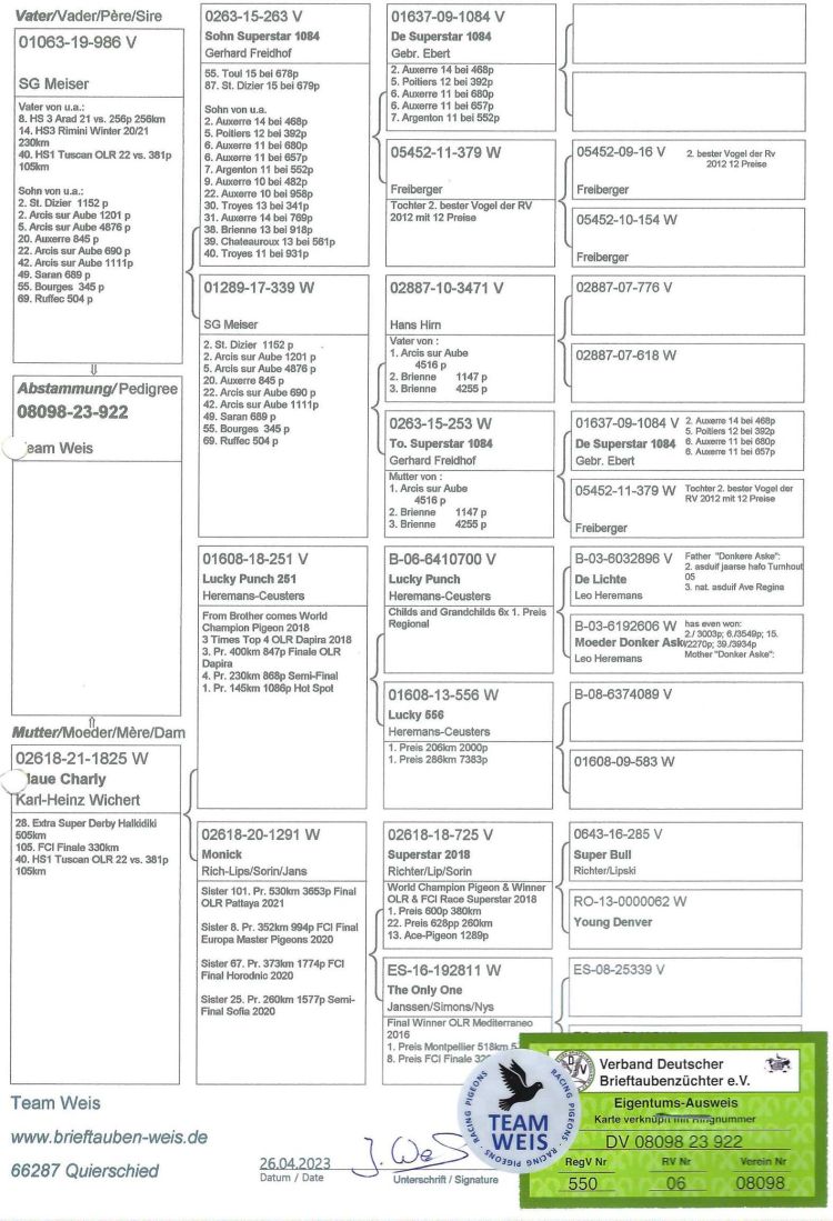 Proprietário: Team Weis - A (273º Final / 359º Pombo Ás)