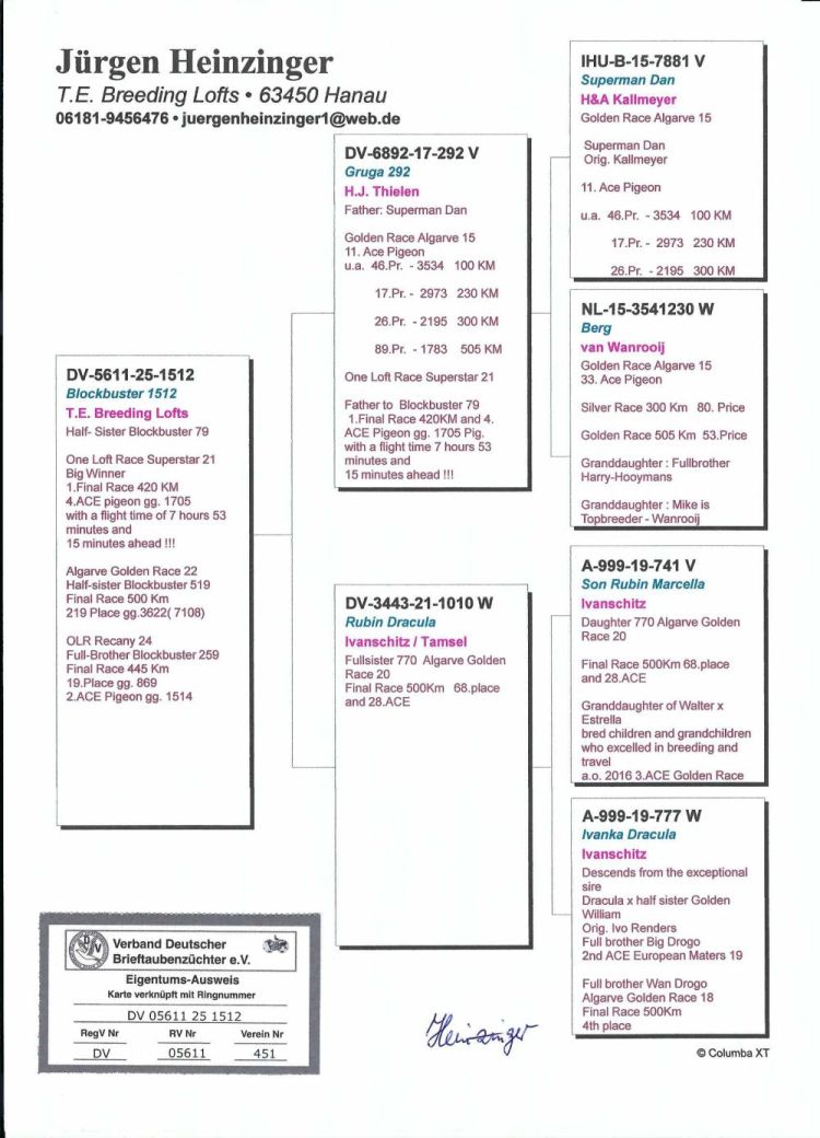 Proprietário: T.E. Breeding Lofts Heinzinger - A (620º Final / 1151º Pombo Ás)