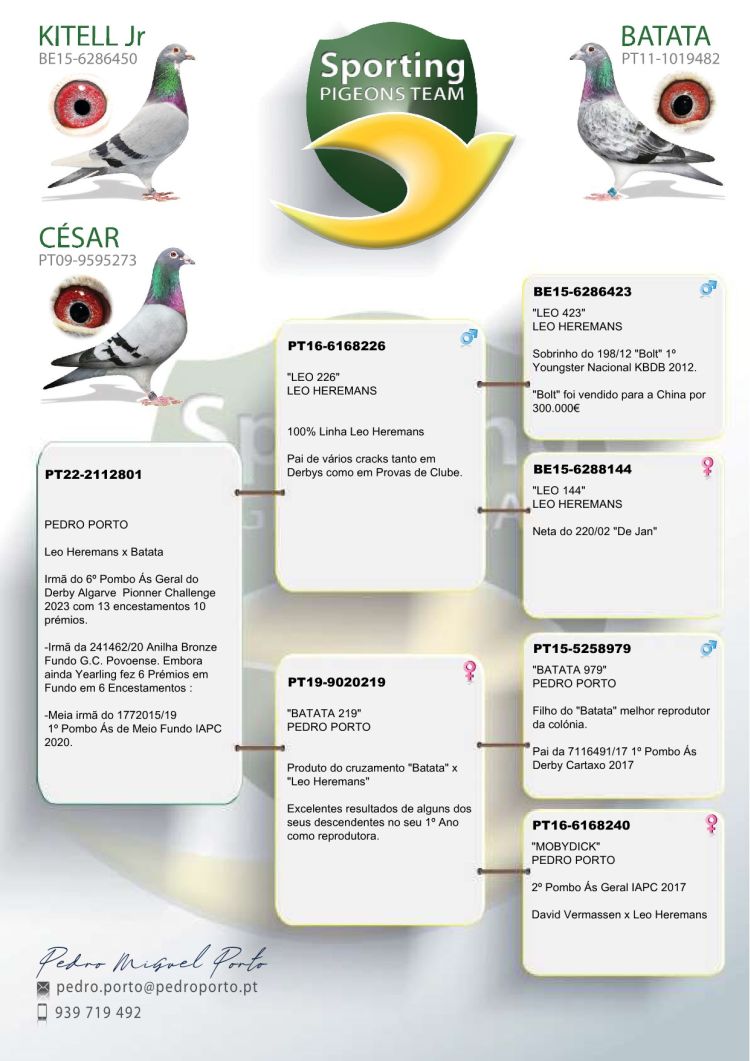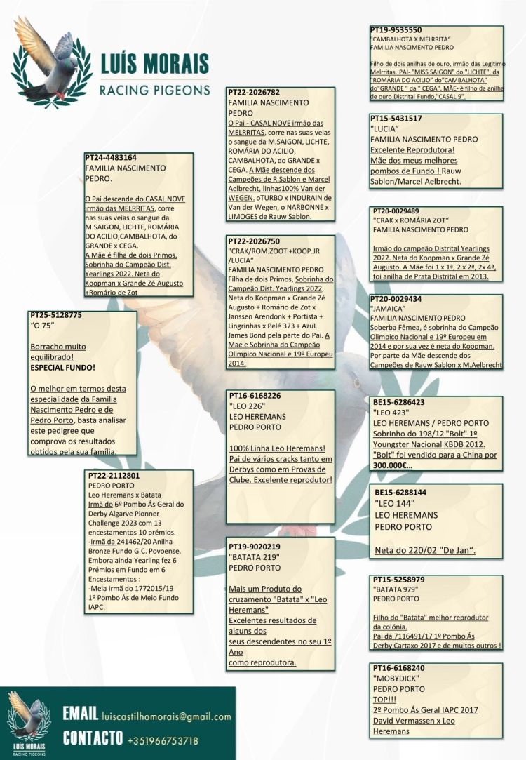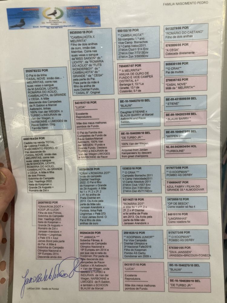 O Pai, jovem Macho Negro da Família Nascimento Pedro, descende do CASAL NOVE irmão das MELRRITAS, dos meus melhores pombos de Fundo Rauw Sablon/Marcel Aelbrecht. corre nas suas veias o sangue da M.SAIGON, LICHTE, ROMÁRIA DO ACILIO, CAMBALHOTA, do GRANDE x CEGA x Campeão Dist. Yearlings 2022. Neta do Koopman x Grande Zé Augusto + Romário de Zot.