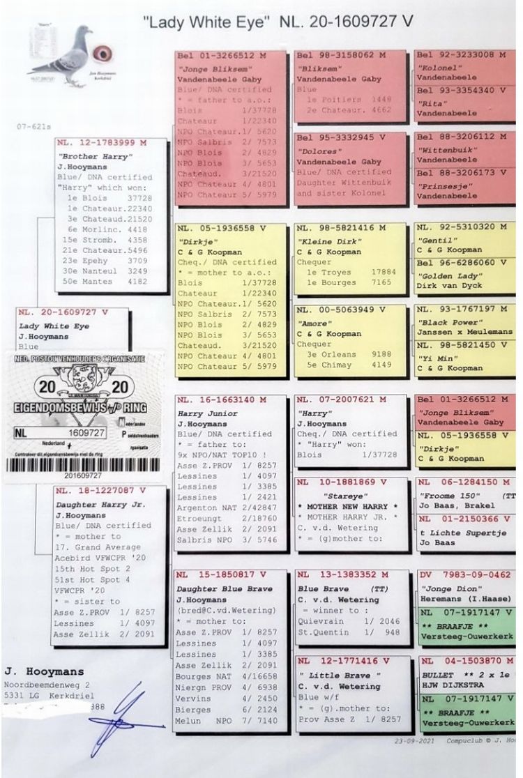 A mãe, foi 67º Pombo Ás no Algarve Great Derby 2023. Fêmea rapidíssima e regular, em 5 provas, fez 3 provas nos 10%, e 2 nos 30%!