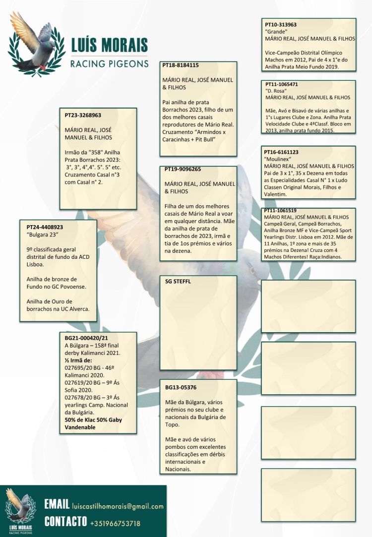 São filhas da estrela da companhia, “a búlgara 23” (ver foto em anexo), foi 9º classificada geral distrital de fundo da ACD Lisboa em 2025. Melhor borracha da ACDL em Fundo, somente em 6 encestamentos, pois decidi não a encestar a Valência. Esteve á disposição no Leilão da venda total de voadores de Setembro, do projeto “Luis Morais & Micael Pedras”, e voltou para casa.