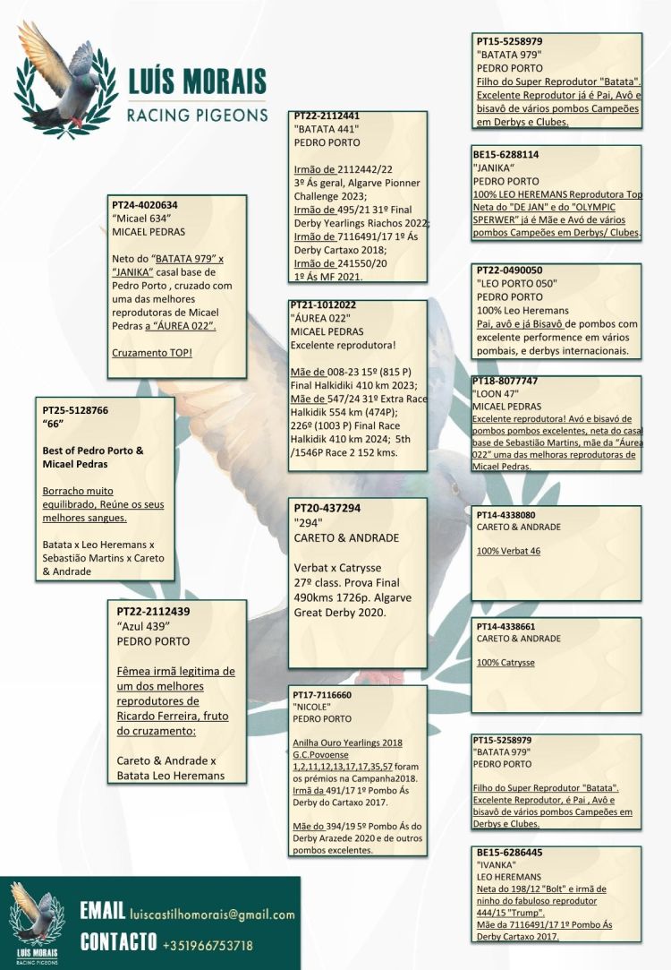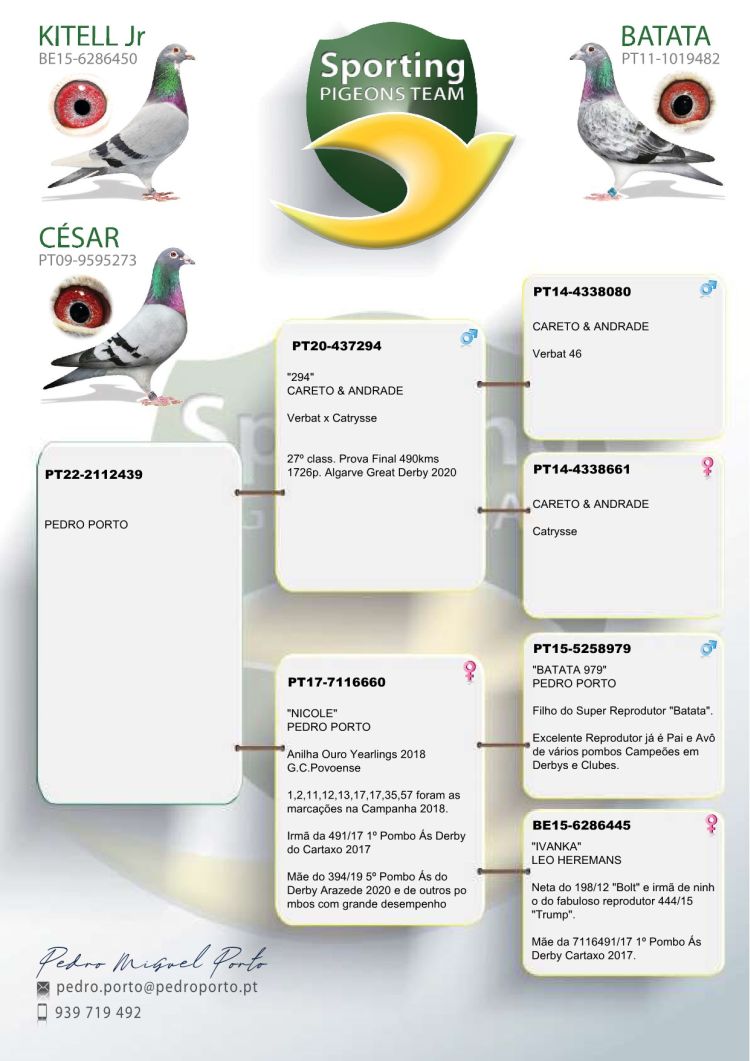A Mãe, é a “Azul 439” PEDRO PORTO, é irmã legitima de um dos melhores reprodutores de Ricardo Ferreira, fruto do cruzamento, Careto & Andrade x Batata Leo Heremans, e filha da Anilha Ouro Yearlings 2018 G.C.Povoense 1,2,11,12,13,17,17,35,57 foram os prémios na Campanha2018.