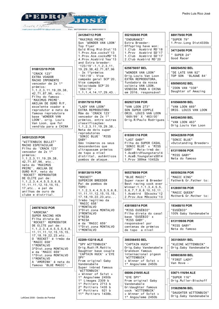 - '943/19' 8.Pombo Ás Derby Arazede 2020 (venceu: 2º,3º,4º,12º, 21º,32º ...) bisneto da 'MAGIC 058' '944/19' 18. Pombo Ás geral Arazede 2020 (venceu: 2º,5º,6º,8º, ...) bisneto da 'MAGIC 058' irmão de ninho do anterior '943/19'