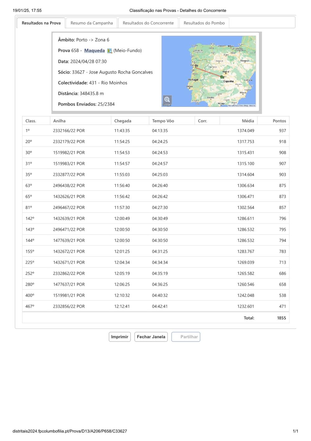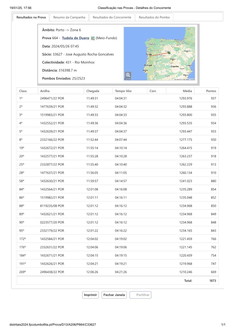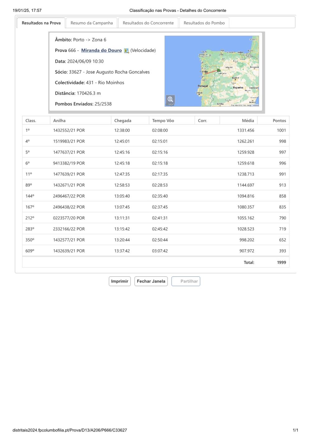 1° CLASSIFICADO VELOCIDADE GRUPO COLUMBOFILO DE CASTELO DE PAIVA